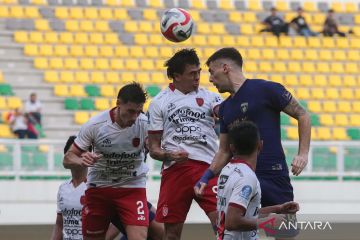 Pesepak bola Persita Tangerang Dejan Racic (kanan) berebut bola di udara dengan pesepak bola Bali United Diego Campos (tengah) dan Joao Ferrari (kiri) pada pertandingan BRI Super League di Banten International Stadium, Kabupaten Serang, Banten, Kamis (23/4/2026). Bali United mengalahkan Persita Tangerang dengan skor 1-0. ANTARA FOTO/Angga Budhiyanto/wsj.