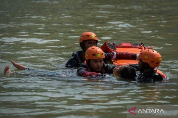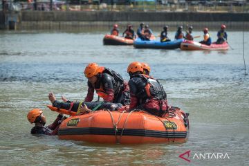 Personel Basarnas melakukan simulasi penyelamatan korban tenggelam di Jembatan Berendeng, Kota Tangerang, Banten, Minggu (26/4/2026). Basarnas, BPBD, Damkar, PMI dan komunitas relawan menggelar simulasi tersebut untuk meningkatkan kewaspadaan serta kemampuan petugas dalam situasi darurat dalam rangka peringatan Hari Kesiapsiagaan Bencana Nasional 2026. ANTARA FOTO/Putra M. Akbar/wsj.