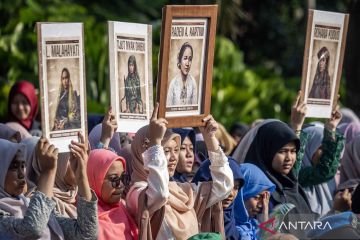 Sejumlah peserta membawa poster tokoh perempuan pada pawai memperingati Hari Kartini saat Hari Bebas Kendaraan Bermotor (HBKB) di Jalan Jenderal Sudirman, Jakarta, Minggu (19/4/2026). Pawai tersebut digelar untuk mengenang perjuangan R.A. Kartini sekaligus mendorong pelestarian budaya serta penguatan peran perempuan dalam pembangunan. ANTARA FOTO/Bayu Pratama S/nym.