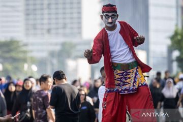 Pemain egrang beratraksi saat mengikuti pentas seni dan budaya saat Hari Bebas Kendaraan Bermotor (HBKB) di Jalan Jenderal Sudirman, Jakarta, Minggu (19/4/2026). Kegiatan tersebut bertujuan untuk mengenalkan seni, budaya serta permainan tradisional Indonesia kepada masyarakat yang mengikuti HBKB. ANTARA FOTO/Bayu Pratama S/nym.