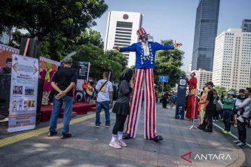 Pemain egrang beratraksi dalam pentas seni dan budaya saat Hari Bebas Kendaraan Bermotor (HBKB) di Jalan Jenderal Sudirman, Jakarta, Minggu (19/4/2026). Kegiatan tersebut bertujuan untuk mengenalkan seni, budaya serta permainan tradisional Indonesia kepada masyarakat yang mengikuti HBKB. ANTARA FOTO/Bayu Pratama S/nym.