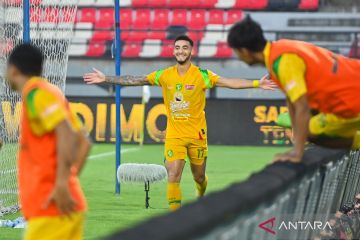 Pesepak bola Persebaya Surabaya Jefferson Silva (tengah) berselebrasi usai mencetak gol ke gawang Arema FC saat pertandingan BRI Super League 2025/2026 di Stadion Kapten I Wayan Dipta, Gianyar, Bali, Selasa (28/4/2026). Arema FC telan kekalahan dari tamunya Persebaya Surabaya 0-4. ANTARA FOTO/Fikri Yusuf/hma