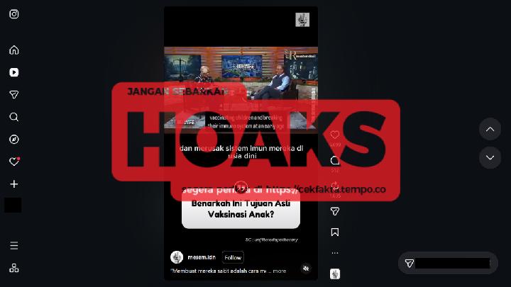 TEMPO.CO, Jakarta - A video circulating on Instagram [archive] since April 15, 2026, claims that the vaccine industry intentionally makes children sick to generate billions of dollars in profit. The content features excerpts from The High Wire podcast with Sherri Tenpenny, an osteopathic physician from Ohio, United States, originally broadcast on October 27, 2025.