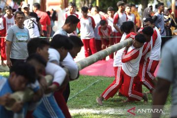 Sejumlah pelajar saling dorong saat mengikuti dagongan pada Festival Olahraga Tradisional di Alun-alun Nganjuk, Jawa Timur, Sabtu (18/4/2026). Festival olahraga tradisional yang diikuti pelajar tingkat SD hingga SMP se-Nganjuk tersebut guna memperingati HUT ke-1.089 Kabupaten Nganjuk sekaligus mendukung implementasi PP Tunas sebagai perlindungan anak di rungan digital termasuk dari paparan media sosial. ANTARA FOTO/Prasetia Fauzani/wsj.