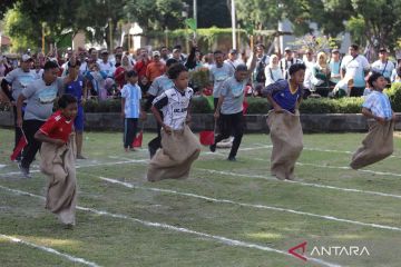 Sejumlah pelajar beradu cepat saat mengikuti balap karung pada Festival Olahraga Tradisional di Alun-alun Nganjuk, Jawa Timur, Sabtu (18/4/2026). Festival olahraga tradisional yang diikuti pelajar tingkat SD hingga SMP se-Nganjuk tersebut guna memperingati HUT ke-1.089 Kabupaten Nganjuk sekaligus mendukung implementasi PP Tunas sebagai perlindungan anak di rungan digital termasuk dari paparan media sosial. ANTARA FOTO/Prasetia Fauzani/wsj.