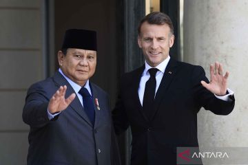 Presiden Prabowo Subianto (kiri) dan Presiden Prancis Emmanuel Macron (kanan) melambaikan tangan saat bertemu di Istana Ãlysée, Paris, Prancis, Selasa (14/4/2026). Pertemuan tersebut membahas seputar penguatan kerja sama strategis di berbagai sektor prioritas kedua negara, antara lain pengadaan alutsista dan penguatan industri pertahanan, transisi energi dan pengembangan energi baru terbarukan, infrastruktur dan transportasi, hingga pendidikan dan ekonomi kreatif. ANTARA FOTO/HO/Bakom RI/YU