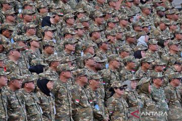 Sejumlah peserta berbaris saat mengikuti upacara penyambutan Retret Ketua DPRD seluruh Indonesia di Kompleks Akademi Militer Magelang, Jawa Tengah, Rabu (15/4/2026). Lembaga Ketahanan Nasional Republik Indonesia (Lemhannas RI) menyelenggarakan Kursus Pemantapan Pimpinan Daerah (KPPD) yang dikemas dalam bentuk retret nasional di Akmil Magelang dan diikuti sebanyak 478 Ketua DPRD dari seluruh Indonesia pada 15-19 April 2026. ANTARA FOTO/Anis Efizudin/YU