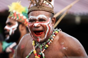 Sejumlah penari membawakan Tari Isosolo atau tari penyambutan saat kunjungan wisatawan mancanegara di Kampung Yobeh, Sentani, Jayapura, Papua, Rabu (15/4/2026). Kementerian Pariwisata mencatat kinerja sektor pariwisata menunjukkan tren positif dengan jumlah kunjungan wisatawan mancanegara pada Februari 2026 mencapai 1,16 juta kunjungan atau meningkat sekitar 13,37 persen dibandingkan periode yang sama tahun sebelumnya sebesar 1,02 juta kunjungan. ANTARA FOTO/Gusti Tanati/YU
