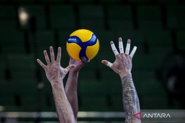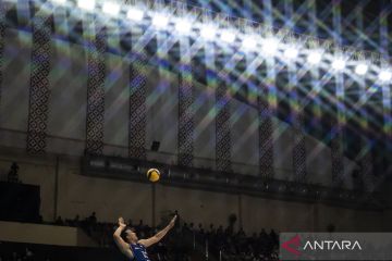 Pevoli Jakarta Lavani Livin Transmedia Hendra Kurniawan melakukan servis ke arah tim Jakarta Bhayangkara Presisi pada pertandingan Final Four Proliga 2026 di GOR Jatidiri, Semarang, Jawa Tengah, Minggu (19/4/2026). Jakarta Lavani Livin Transmedia menjadi juara final four putaran kedua putra Proliga 2026 usai menang atas Jakarta Bhayangkara Presisi dengan skor 3-1 (25-20, 25-15, 18-25, 25-22). ANTARA FOTO/Aprillio Akbar/agr
