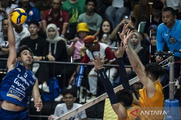Pevoli Jakarta Lavani Livin Transmedia Taylor Lee Sander (kiri) melepaskan smes ke arah tim Jakarta Bhayangkara Presisi pada pertandingan Final Four Proliga 2026 di GOR Jatidiri, Semarang, Jawa Tengah, Minggu (19/4/2026). Jakarta Lavani Livin Transmedia menjadi juara final four putaran kedua putra Proliga 2026 usai menang atas Jakarta Bhayangkara Presisi dengan skor 3-1 (25-20, 25-15, 18-25, 25-22). ANTARA FOTO/Aprillio Akbar/agr
