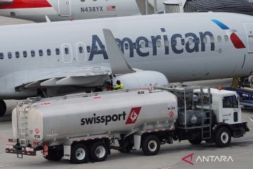 Truk pengisian bahan bakar terlihat di Bandara LaGuardia, New York, Amerika Serikat, Kamis (23/04/26). Maskapai-maskapai besar di Amerika Serikat tengah menghadapi dampak finansial yang signifikan akibat melonjaknya harga bahan bakar jet yang dipicu konflik berkepanjangan di Timur Tengah, sehingga memaksa sejumlah operator memangkas atau menangguhkan proyeksi kinerja tahunan mereka. ANTARA FOTO/Xinhua/Zhang Fengguo/bar