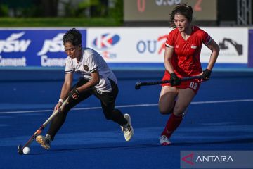 Pemain hoki putri Indonesia Maulani Salma (kiri) berusaha mengontrol bola melewati adangan pemain hoki putri Singapura Nadiah Ong (kanan) pada pertandingan kualifikasi Asian Games 2026 di Lapangan Hoki Gelora Bung Karno, Senayan, Jakarta, Minggu (26/4/2026). Tim hoki putri Indonesia menang dengan skor 2-0. ANTARA FOTO/Fauzan/wsj.