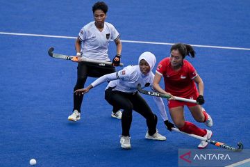 Sejumlah pemain hoki putri Indonesia berselebrasi usai mencetak gol ke gawang tim hoki putri Singapura pada pertandingan kualifikasi Asian Games 2026 di Lapangan Hoki Gelora Bung Karno, Senayan, Jakarta, Minggu (26/4/2026). Tim hoki putri Indonesia menang dengan skor 2-0. ANTARA FOTO/Fauzan/wsj.