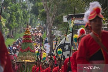 Warga berebut gunungan hasil pertanian saat kirab budaya di Desa Margokaton, Seyegan, Sleman, D.I Yogyakarta, Minggu (19/4/2026). Kirab budaya itu menampilkan berbagai potensi desa, salah satunya adalah sektor pertanian yang menjadi sumber kehidupan bagi sebagian besar warga di desa tersebut. ANTARA FOTO/Andreas Fitri Atmoko/agr