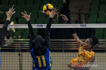 Pevoli Jakarta Popsivo Polwan Yonkaira Pena (kanan) melepaskan smes yang coba diblok pevoli Jakarta Electric PLN Mobile Ersandrina Devega Salsabila (kiri) pada pertandingan Final Four Proliga 2026 di GOR Jatidiri, Semarang, Jawa Tengah, Sabtu (18/4/2026). Jakarta Popsivo Polwan menang dengan skor 3-1 (21-25, 27-25, 25-19, dan 25-18). ANTARA FOTO/Aprillio Akbar/wsj.
