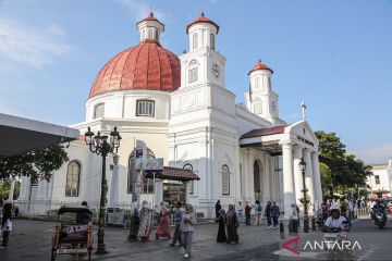=Sejumlah wisatawan domestik berkunjung ke kawasan wisata Cagar Budaya Nasional Kota Lama, Semarang, Jawa Tengah, Minggu (26/4/2026). Dinas Kebudayaan, Pariwisata, dan Ekonomi Kreatif Jawa Tengah mencatat kinerja sektor pariwisata provinsi tersebut pada Kuartal-I 2026 tumbuh positif dengan total kunjungan mencapai 17,21 juta orang baik wisatawan nusantara dan mancanegara atau meningkat sebesar 18,72 persen dibandingkan periode yang sama tahun lalu yakni sebanyak 13,98 juta orang. ANTARA FOTO/Makna Zaezar/wsj.