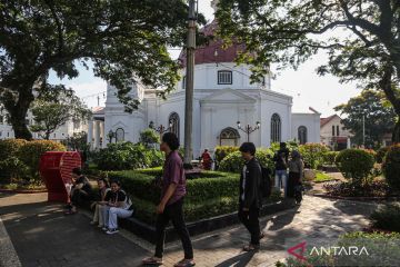 Sejumlah wisatawan domestik berkunjung ke kawasan wisata Cagar Budaya Nasional Kota Lama, Semarang, Jawa Tengah, Minggu (26/4/2026). Dinas Kebudayaan, Pariwisata, dan Ekonomi Kreatif Jawa Tengah mencatat kinerja sektor pariwisata provinsi tersebut pada Kuartal-I 2026 tumbuh positif dengan total kunjungan mencapai 17,21 juta orang baik wisatawan nusantara dan mancanegara atau meningkat sebesar 18,72 persen dibandingkan periode yang sama tahun lalu yakni sebanyak 13,98 juta orang. ANTARA FOTO/Makna Zaezar/wsj.