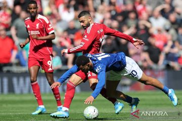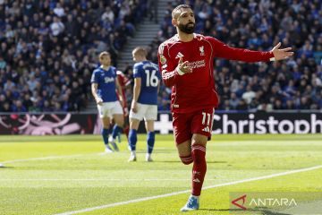 Pesepak bola Liverpool Mohamed Salah melakukan selebrasi seusai mencetak gol saat pertandingan Liga Inggris Liverpool melawan Everton di Stadion Hill Dickinson, Liverpool, Inggris, Minggu (19/4/2026). Liverpool meraih kemenangan dramatis 2-1 atas Everton. ANTARA FOTO/REUTERS/Jason Cairnduff/agr