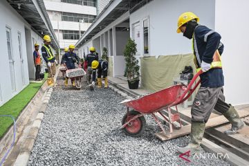 Pembangunan hunian warga bantaran rel kereta api. Pekerja memasang kasur di lokasi proyek pembangunan rumah layak huni, Senen, Jakarta, Kamis (23/4/2026). Kementerian Perumahan dan Kawasan Permukiman (PKP) membangun sekitar 324 unit rumah yang dilengkapi fasilitas umum seperti toilet komunal, mushalla, dan dapur umum untuk warga yang tinggal di bantaran rel kereta api Pasar Senen. ANTARA FOTO/Sulthony Hasanuddin/sgd
