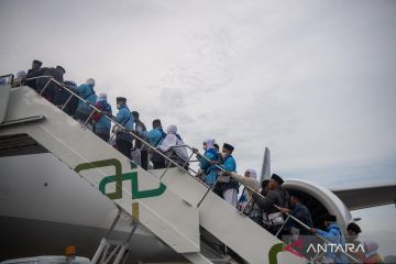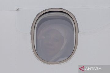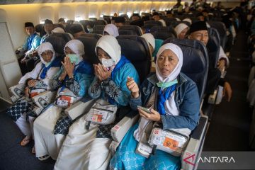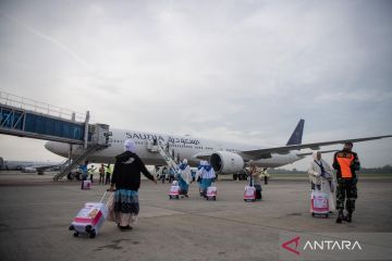 Calon haji kelompok terbang (kloter) pertama embarkasi Palembang (PLM 01) berada di dalam pesawat Saudia yang akan membawanya menuju tanah suci, di Bandara Internasional Sultan Mahmud Baddarudin (SMB) II Palembang, Sumatera Selatan, Rabu (22/4/2026). Sebanyak 443 jamaah calon haji asal Kabupaten Ogan Komering Ulu (OKU) Timur diberangkatkan ke Arab Saudi untuk menunaikan ibadah haji. ANTARA FOTO/Nova Wahyudi/wsj.