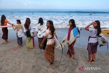 Peselancar perempuan mengikuti Kartini Go Surf 2026 di Pantai Kuta, Badung, Bali, Minggu (19/4/2026). Kegiatan berselancar mengenakan kebaya tersebut diikuti 20 peserta dengan enam di antaranya penyandang tunarungu dan seorang warga negara Jepang sebagai perayaan memperingati Hari Kartini. ANTARA FOTO/Nyoman Hendra Wibowo/nym.
