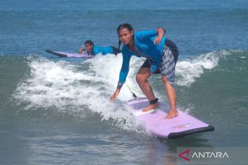 Peselancar tunarungu mengikuti Kartini Go Surf 2026 di Pantai Kuta, Badung, Bali, Minggu (19/4/2026). Kegiatan berselancar mengenakan kebaya tersebut diikuti 20 peserta dengan enam di antaranya penyandang tunarungu dan seorang warga negara Jepang sebagai perayaan memperingati Hari Kartini. ANTARA FOTO/Nyoman Hendra Wibowo/nym.