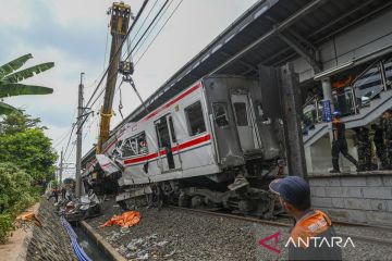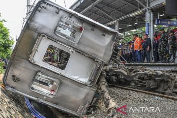 Petugas menggunakan alat berat untuk memindahkan gerbong KRL Commuterline pascakecelakaan dengan KA Argo Bromo Anggrek relasi Gambir-Surabaya Pasar Turi di Stasiun Bekasi Timur, Bekasi, Jawa Barat, Selasa (28/4/2026). Menurut data PT KAI sebanyak 14 orang meninggal dunia dan 84 orang mengalami luka dan para korban menjalani perawatan di RSUD Bekasi, RS Bella Bekasi, RS Bhakti Kartini, RS Hermina Bekasi, RS Hermina Bekasi, RS Mitra Keluarga Bekasi Timur, RS Mitra Plumbon, RS Primaya, RS Siloam Bekasi Timur, RSUD Kabupaten Bekasi, dan RS Mitra Barat dan RS Polri Kramat Jati. ANTARA FOTO/Galih Pradipta/tom.
