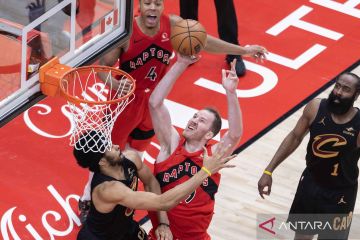 Pebasket Toronto Raptors Jakob Poeltl (tengah) memasukkan bola yang diadang pebasket Cleveland Cavaliers dalam pertandingan bola basket babak pertama playoff NBA 2025-2026 di Toronto, Kanada, Senin (27/4/2026). Toronto Raptors mengalahkan Cleveland Cavaliers dengan skor 93-89. ANTARA FOTO/Xinhua/Zou Zheng/nym.