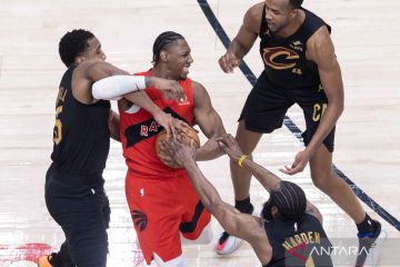 Pebasket Toronto Raptors RJ Barrett (tengah) berebut bola dengan pebasket Cleveland Cavaliers Donovan Mitchell (kiri) and James Harden (bawah) dalam pertandingan bola basket babak pertama playoff NBA 2025-2026 di Toronto, Kanada, Senin (27/4/2026). Toronto Raptors mengalahkan Cleveland Cavaliers dengan skor 93-89. ANTARA FOTO/Xinhua/Zou Zheng/nym.