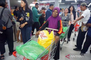 Warga mendorong troli belanja seusai menerima bantuan belanja dari Wakil Presiden Gibran Rakabuming Raka di Kota Sorong, Papua Barat Daya, Selasa (21/4/2026). Dalam kunjungan perdananya di Provinsi Papua Barat Daya, Wakil Presiden Gibran Rakabuming Raka memberikan bantuan belanja sembako senilai Rp500 ribu untuk 100 mama Papua. ANTARA FOTO/Olha Mulalinda/nym.