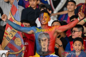 Suporter beraksi saat menyaksikan pertandingan Barcelona Legends melawan DRX World Legends pada pertandingan bertajuk Clash of Legends di Stadion Utama Gelora Bung Karno, Senayan, Jakarta, Sabtu (18/4/2026). Barcelona Legends menang dengan skor 3-0. ANTARA FOTO/Fauzan/nym.