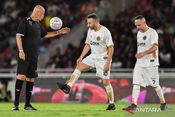 Pesepak bola DRX World Legends Alessandro Del Piero (tengah) bersama Franck Ribery (kanan) memberikan bola kepada wasit Pierluigi Collina (kiri) saat jeda pertandingan melawan Barcelona Legends pada Clash of Legends di Stadion Utama Gelora Bung Karno, Senayan, Jakarta, Sabtu (18/4/2026). Barcelona Legends menang dengan skor 3-0. ANTARA FOTO/Fauzan/nym.
