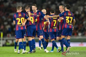 Sejumlah pesepak bola Barcelona Legends melakukan selebrasi usai mencetak gol ke gawang DRX World Legends pada pertandingan bertajuk Clash of Legends di Stadion Utama Gelora Bung Karno, Senayan, Jakarta, Sabtu (18/4/2026). Barcelona Legends menang dengan skor 3-0. ANTARA FOTO/Fauzan/nym.