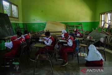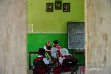 Sejumlah siswa SDN Supiturang 02 mengikuti proses pembelajaran di ruang kelas madrasah diniyah di Desa Supiturang, Kecamatan Pronojiwo, Lumajang, Jawa Timur, Senin (20/4/2026). Sebanyak 70 siswa menggunakan ruang kelas madrasah diniyah sebagai tempat belajar sementara sejak Januari 2026 sambil menunggu relokasi sekolah yang rusak akibat erupsi Gunung Semeru. ANTARA FOTO/Irfan Sumanjaya/YU