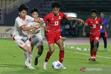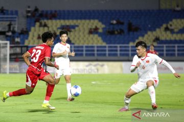 Pesepak bola Timnas Indonesia U-17 Chico Jericho Yarangga (kiri) menggiring bola dan diadang pesepak bola Timnas Vietnam U-17 Hoang Viet Tran (kanan) pada pertandingan penyisihan Grup A ASEAN U-17 Boys Championship atau AFF U-17 di Stadion Gelora Delta Sidoarjo, Jawa Timur, Minggu (19/4/2026). Timnas Indonesia gagal ke semifinal Piala AFF U17 2026 karena hanya berada di peringkat ketiga grup A setelah imbang 0-0 dengan Vietnam pada laga terakhir grup tersebut. ANTARA FOTO/Umarul Faruq/agr
