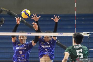 Pebola voli Surabaya Samator Hadi Suharto (tengah) dan Jordan Michael Imanuel Dwi Susanto (kanan) memblok smes pebola voli Jakarta Garuda Jaya Movsar Bataev (kiri) pada pertandingan perebutan peringkat ketiga Proliga 2026 di GOR Amongrogo, Yogyakarta, Kamis (23/4/2026). Surabaya Samator meraih peringkat ketiga Proliga 2026 setelah mengalahkan Jakarta Garuda Jaya dengan Skor 3-0 (25-19, 25-17, 25-20). ANTARA FOTO/Andreas Fitri Atmoko/wsj.