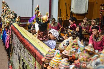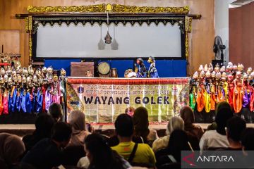 Pengunjung menyaksikan penampilan dalang cilik Kresna Lesmana saat pementasan wayang golek berlakon Somantri Duta di Museum Wayang, Jakarta, Minggu (26/4/2026). Dinas Pariwisata dan Kebudayaan DKI Jakarta menampilkan dalang cilik tersebut untuk melestarikan dan menumbuhkembangkan kesenian wayang golek di kalangan anak-anak dan generasi muda. ANTARA FOTO/Ahmad Naufal Oktavian/wsj.