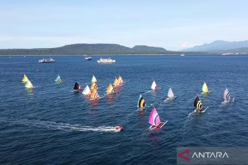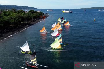 Foto udara perahu layar beradu cepat dalam balapan perahu layar antarnelayan di Pantai Bulusan, Ketapang, Banyuwangi, Jawa Timur, Minggu (19/4/2026). Ajang yang diikuti puluhan nelayan di pesisir Selat Bali itu selain menjadi sarana silaturahmi nelayan Banyuwangi dan Gilimanuk, Bali, juga untuk menarik kunjungan wisatawan. ANTARA FOTO/Budi Candra Setya/agr