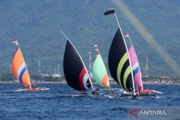 Perahu layar beradu cepat dalam balapan perahu layar antarnelayan di Pantai Bulusan, Ketapang, Banyuwangi, Jawa Timur, Minggu (19/4/2026). Ajang yang diikuti puluhan nelayan di pesisir Selat Bali itu selain menjadi sarana silaturahmi nelayan Banyuwangi dan Gilimanuk, Bali, juga untuk menarik kunjungan wisatawan. ANTARA FOTO/Budi Candra Setya/agr